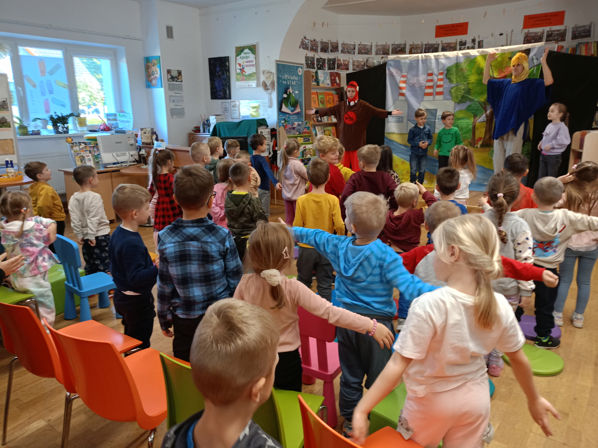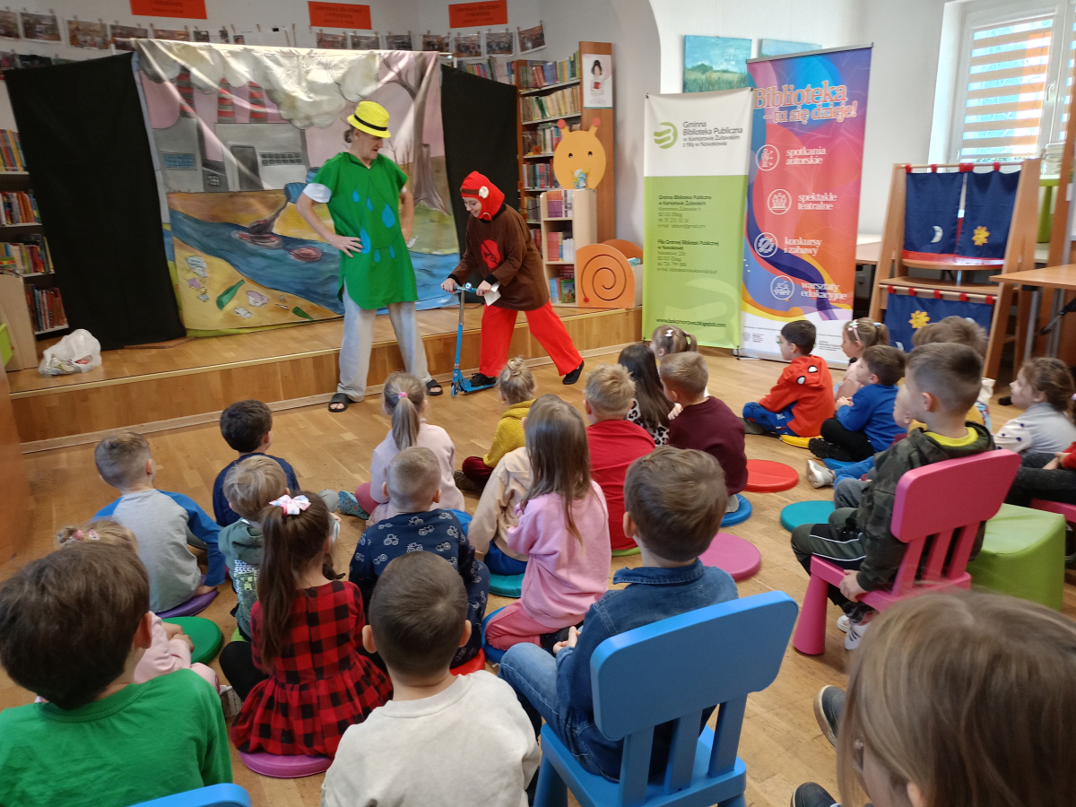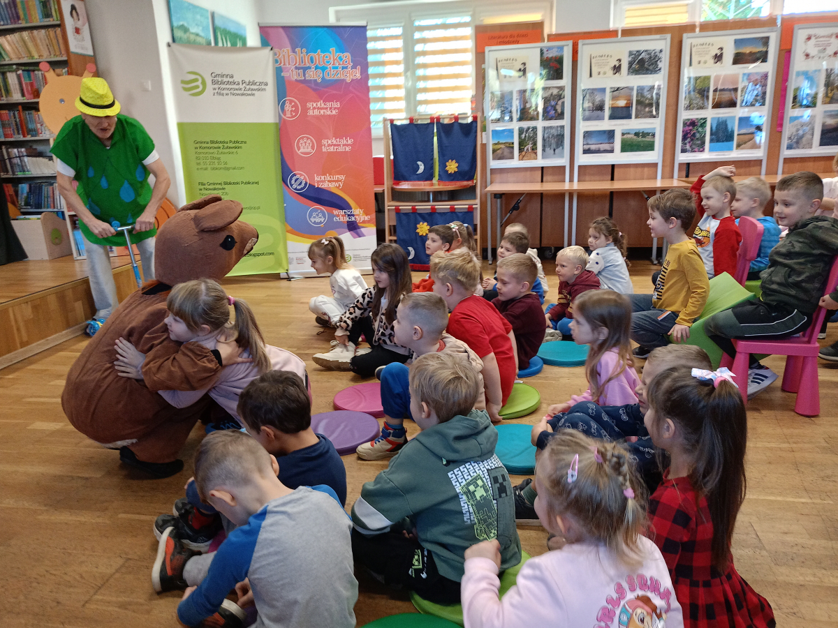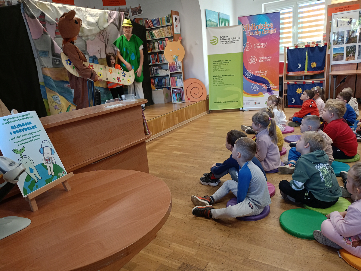 21 października 2025 r. w Gminnej Bibliotece Publicznej w Komorowie Żuławskim odbyło się radosne spotkanie z teatrem. Przedszkolaki z Gronowa Górnego obejrzały przedstawienie teatralne pt. „Klimacik i Decybelek” – pełne humoru, muzyki i ciekawych opowieści o ekologii oraz dbaniu o środowisko. Dzieci z ogromnym zaangażowaniem uczestniczyły w spektaklu, śpiewały, odpowiadały na pytania aktorów i wspólnie z bohaterami uczyły się, jak dbać o naszą planetę i unikać hałasu. Było kolorowo, wesoło i bardzo pouczająco. Takie spotkania to najlepszy sposób, by przez zabawę przekazywać najmłodszym ważne wartości.